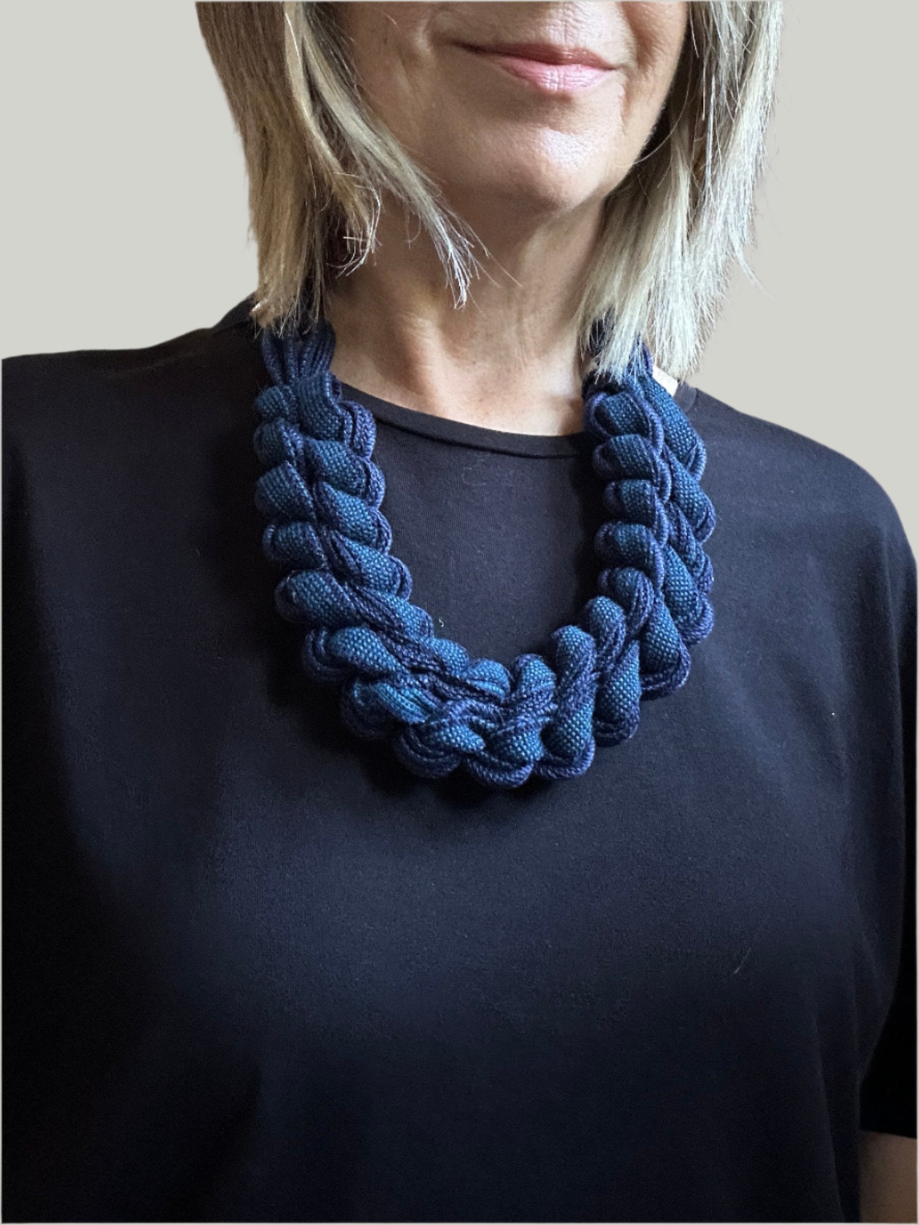 Chunky wool bias tape is folded, layered and braided, and hand sewn in place. Tied with a soft adjustable tape to the your preferred length.