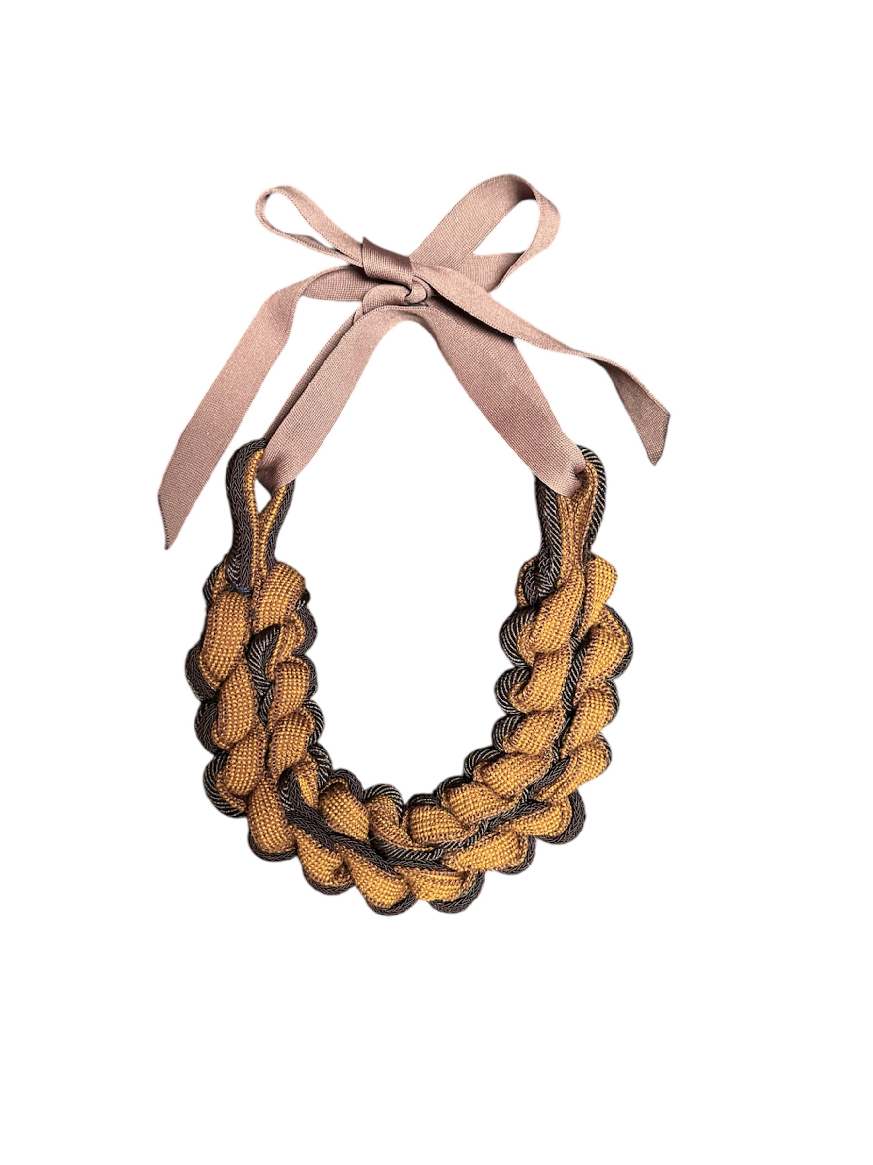Designed with wool bias tape, it is braided and tied with a soft adjustable tape.